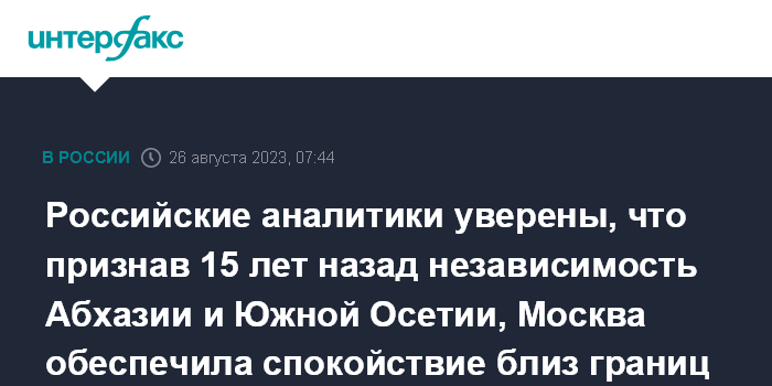 Москва. 26 августа. INTERFAX.RU - Признание Россией независимости Абхазии и Южной Осетии, состоявшееся ровно 15 лет назад, стало важным шагом Москвы с точки зрения обеспечения безопасности как этих двух республик, так и в регионе в целом, полагает заместитель директора Института стран СНГ Владимир Жарихин.