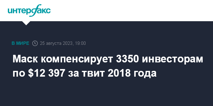 Маск компенсирует 3350 инвесторам по $12 397 за твит 2018 года
