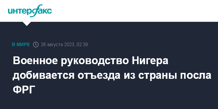 Москва. 26 августа. INTERFAX.RU - Захватившие власть в Нигере военные дали послу ФРГ Оливеру Шнакенбергу 48 часов на то, чтобы покинуть страну, сообщают в ночь на субботу европейские СМИ.