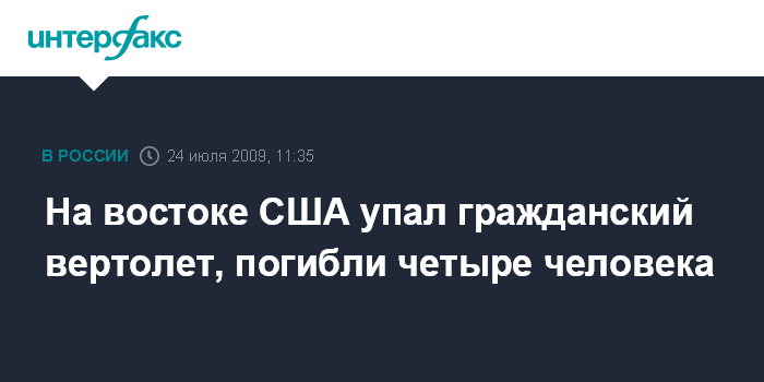 Москва. 24 июля. INTERFAX.RU - По меньшей мере четыре человека погибли в результате падения гражданского вертолета на скоростное шоссе в штате Мэриленд на востоке США, сообщает британская телерадиокорпорация Би-би-си.