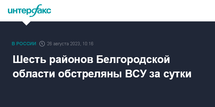 Москва. 26 августа. INTERFAX.RU - Губернатор Белгородской области Вячеслав Гладков сообщил в субботу в своем телеграм-канале об ударах, нанесенных ВСУ по территории региона за минувшие сутки.