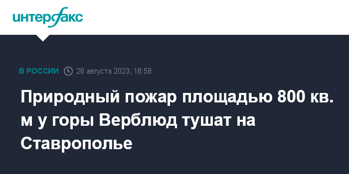 Москва. 26 августа. INTERFAX.RU - Спасатели тушат природный пожар у горы Верблюд в регионе Кавказских Минеральных Вод (Ставропольский край), сообщает в субботу пресс-служба ГУ МЧС по региону.