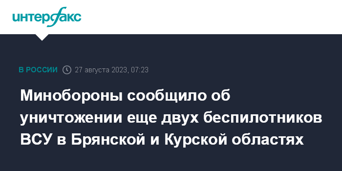Москва. 27 августа. INTERFAX.RU - Российские военные уничтожили два украинских беспилотника самолетного типа над Брянской и Курской областями, сообщили в Минобороны РФ.