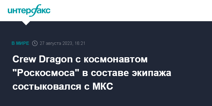 Москва. 27 августа. INTERFAX.RU - Американский многоразовый космический корабль Crew Dragon компании SpaceX с тремя астронавтами и космонавтом "Роскосмоса" на борту, выведенный накануне на орбиту, в воскресенье успешно пристыковался к Международной космической станции (МКС), сообщает НАСА.
