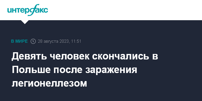 Москва. 28 августа. INTERFAX.RU - В польском городе Жешув (Подкарпатское воеводство) вследствие заражения легионеллезом скончалась девятая пациентка, сообщает в понедельник телеканал Polsat.