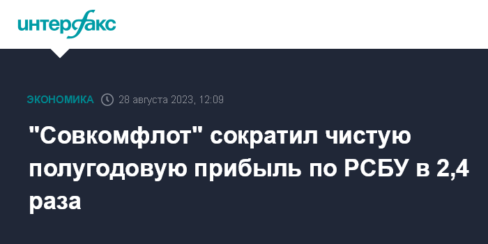 Москва. 28 августа. INTERFAX.RU - В I полугодии 2023 года чистая прибыль ПАО "Совкомфлот" по РСБУ составила 989,5 млн рублей, что в 2,4 раза меньше, чем в аналогичном периоде прошлого года, говорится в отчетности компании.