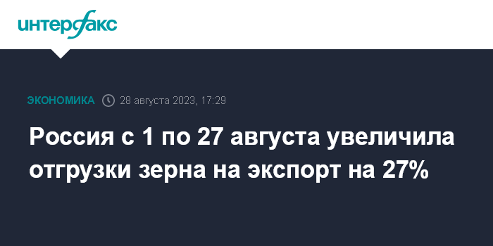 Россия с 1 по 27 августа увеличила отгрузки зерна на экспорт на 27%