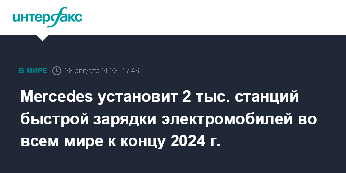 Москва. 28 августа. INTERFAX.RU - Германский производитель автомобилей Mercedes-Benz Group AG планирует открыть 2 тыс. станций для быстрой зарядки электрокаров по всему миру к концу 2024 года, говорится в пресс-релизе компании.