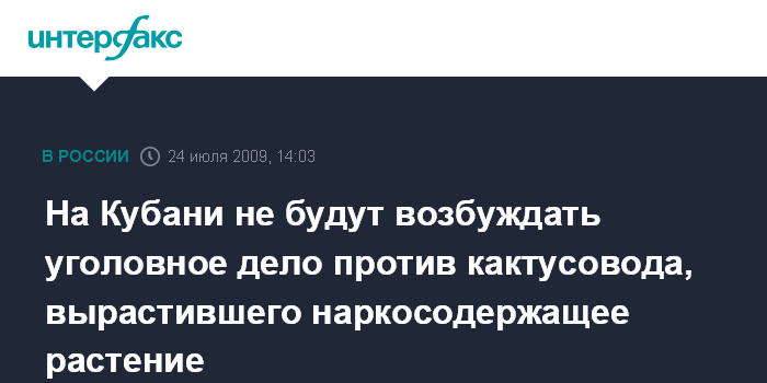 Москва. 24 июля. INTERFAX.RU - Кубанские наркополицейские не будут преследовать известного местного кактусовода Сергея Калмыкова за культивирование запрещенного кактуса, однако попросили больше не выращивать подобные растения. Как пояснили агентству "Интерфакс-Юг" в УФСКН по Краснодарскому краю, по результатам проверки принято решение уголовное дело в отношении кактусовода не возбуждать.