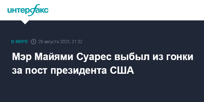 Москва. 29 августа. INTERFAX.RU - Мэр Майями Фрэнсис Суарес, участвовавший в борьбе за выдвижение кандидатом в президенты США от Республиканской партии, заявил во вторник, что останавливает свою президентскую кампанию.