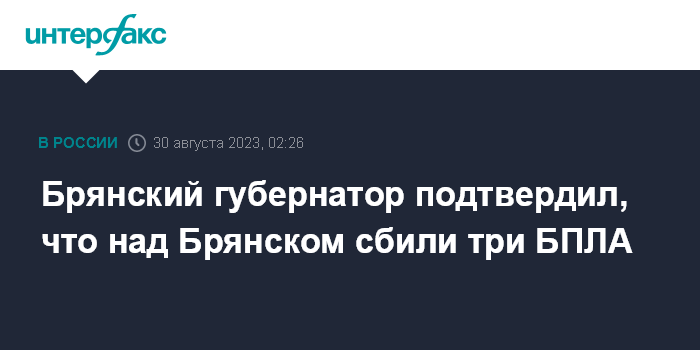 Москва. 30 августа. INTERFAX.RU - Губернатор Брянской области Александр Богомаз сообщил об уничтожении силами ПВО трех беспилотников над Брянском.