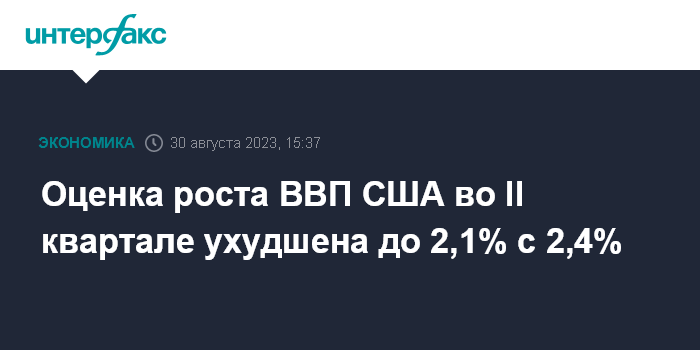 Москва. 30 августа. INTERFAX.RU - Экономика США во втором квартале выросла на 2,1% в пересчете на годовые темпы, согласно пересмотренным данным министерства торговли Соединенных Штатов.