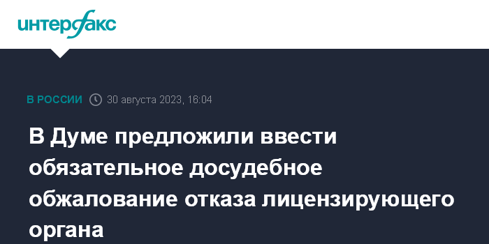 Москва. 30 августа. INTERFAX.RU - Группа депутатов внесла в Госдуму законопроект, который вводит процедуру обязательного досудебного обжалования отказа лицензирующего органа в предоставлении соискателю лицензии, сейчас соискатель имеет право обратиться напрямую в суд, минуя досудебные разбирательства.
