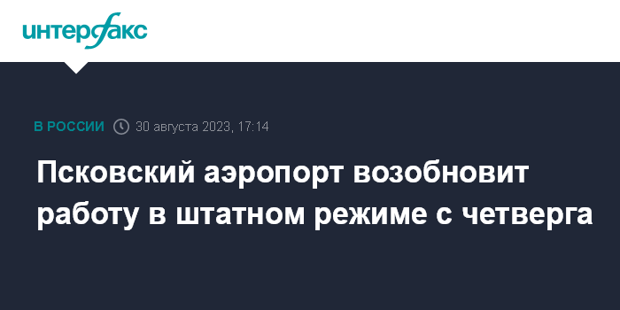 Москва. 30 августа. INTERFAX.RU - Аэропорт Пскова с четверга, 31 августа, возобновляет работу в штатном режиме, сообщил губернатор региона Михаил Ведерников в своем телеграм-канале в среду.