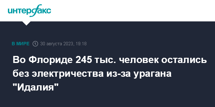 Москва. 30 августа. INTERFAX.RU - Ураган "Идалия", ударивший по юго-востоку США, оставил более 245 тысяч человек без электричества в штате Флорида, сообщают американские СМИ.