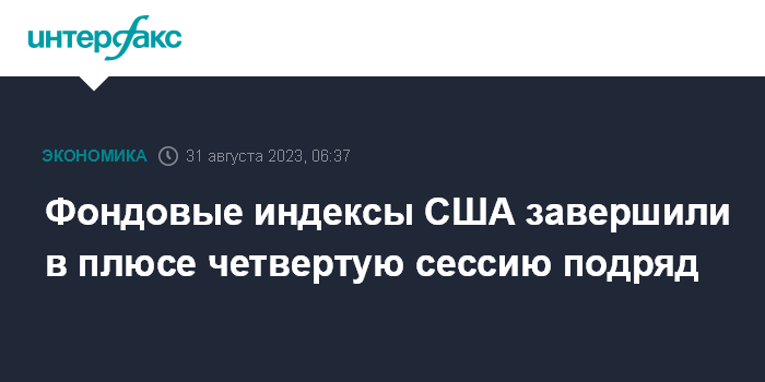Москва. 31 августа. INTERFAX.RU - Американские фондовые индексы выросли в среду по итогам четвертой сессии подряд благодаря сигналам ослабления экономики США, утвердившим инвесторов во мнении о том, что Федеральная резервная система (ФРС) близка к завершению цикла ужесточения денежно-кредитной политики.