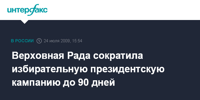 Москва. 24 июля. INTERFAX.RU - Верховная Рада сократила срок избирательной президентской кампании со 120 до 90 дней. За соответствующий закон проголосовали в пятницу 316 из 431 народных депутатов.
