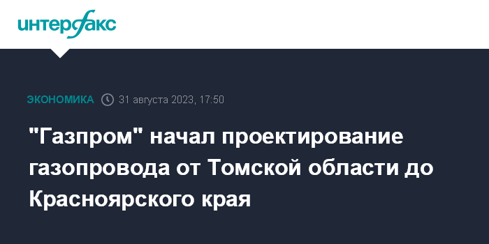 Москва. 31 августа. INTERFAX.RU - "Газпром" начал проектно-изыскательские работы в рамках проекта строительства 700-километрового газопровода от Томской области до Красноярского края, сообщил вице-премьер Александр Новак на совещании у президента РФ Владимира Путина по вопросам развития края.
