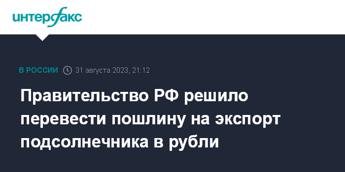 Москва. 31 августа. INTERFAX.RU - Правительство РФ приняло решение о переводе пошлины на экспорт подсолнечника в рубли.