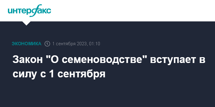 Москва. 1 сентября. INTERFAX.RU - Федеральный закон "О семеноводстве" (№454-ФЗ), принятый в конце 2021 года, вступает в силу в РФ 1 сентября 2023 года.