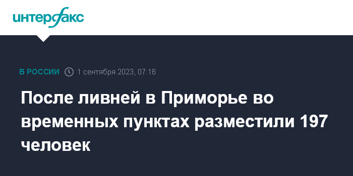 Москва. 1 сентября. INTERFAX.RU - После ливней, вызвавших подтопления в Приморье, в пунктах временного размещения находятся около 200 человек, сообщила в пятницу пресс-служба краевого главка МЧС РФ.