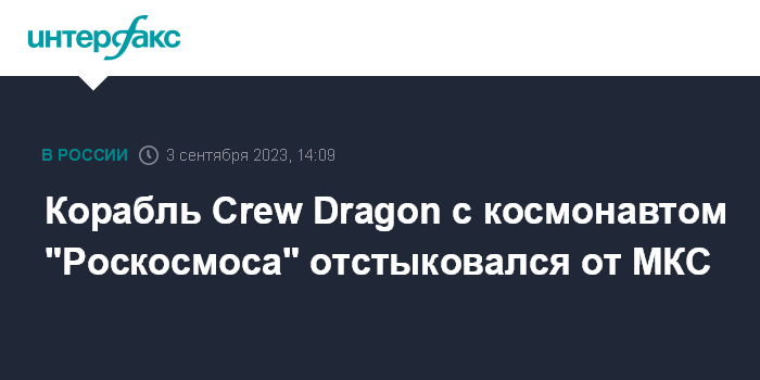 Москва. 3 сентября. INTERFAX.RU - Космический корабль Crew Dragon-6 компании SpaceX с экипажем в составе трех астронавтов и космонавта "Роскосмоса" в воскресенье расстыковался с Международной космической станцией (МКС) для возвращения на Землю, сообщило NASA.