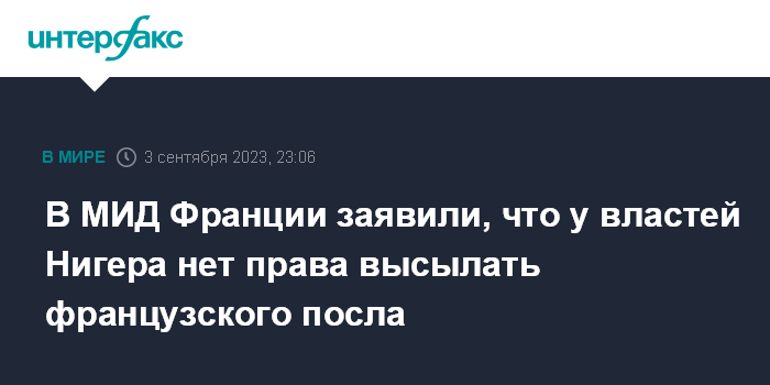 Нигерские военные 25 августа потребовали от французского посла покинуть Нигер в течение 48 часов и объявили Парижу об отзыве агремана. В среду, 31 августа, путчисты приказали полиции выдворить дипломата из страны, вновь дав ему на сборы двое суток.