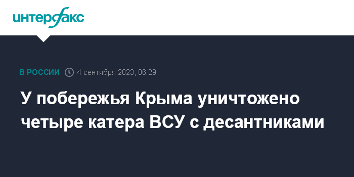 Москва. 4 сентября. INTERFAX.RU - Российские самолеты уничтожили в Черном море четыре военных катера американского производства с десантными группами вооруженных сил Украины (ВСУ), заявили в Минобороны РФ.