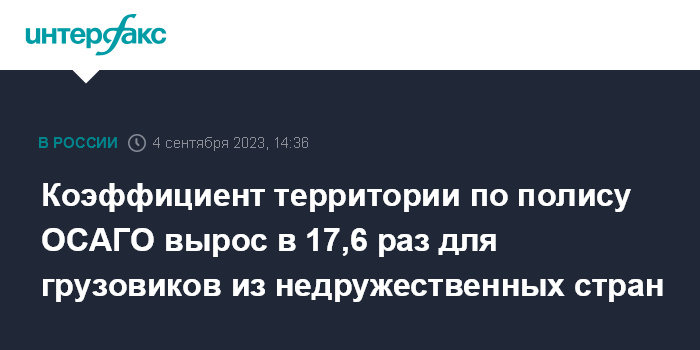 Москва. 4 сентября. INTERFAX.RU - Банк России увеличил коэффициент территории по полисам ОСАГО для грузовиков, въезжающих в РФ из недружественных стран, с 1,7 до 30, следует из указания регулятора (№6510-У). В проекте указания тот же коэффициент предполагалось увеличить до 12,5. Таким образом, в итоговом документе коэффициент для грузовиков из недружественных стран вырос еще в 2,4 раза.