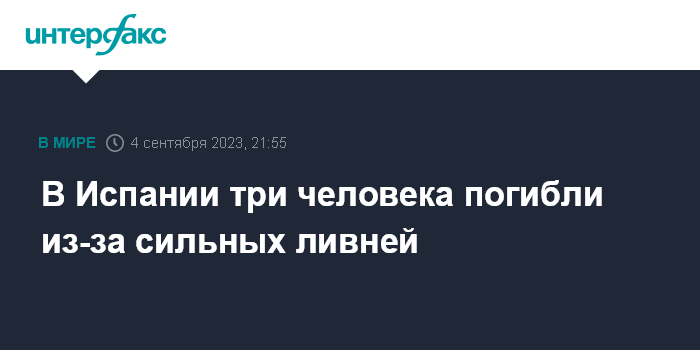 Москва. 4 сентября. INTERFAX.RU - Три человека погибли, один пропал без вести в провинции Толедо (автономное сообщество Кастилья-Ла-Манча, центральная часть Испании) в результате обрушившихся на значительную часть страны ливневых дождей, сообщает в понедельник телеканал РТВЕ.