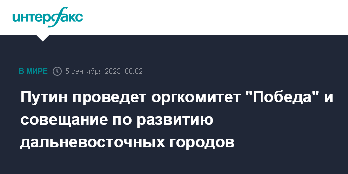 Москва. 5 сентября. INTERFAX.RU - Президент РФ Владимир Путин во вторник, 5 сентября в режиме видеоконференцсвязи проведет заседание Российского организационного комитета "Победа", сообщает пресс-служба Кремля.