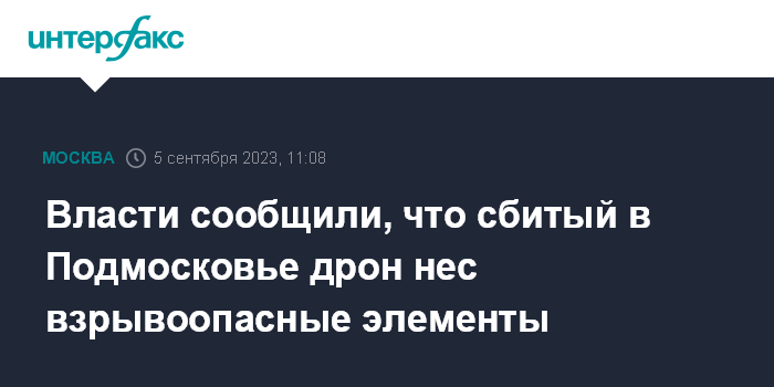 Москва. 5 сентября. INTERFAX.RU - Сбитый над территорией городского округа Истра в Подмосковье беспилотник, по предварительным данным, был начинен взрывоопасными элементами, сообщила глава муниципалитета Татьяна Витушева во вторник.