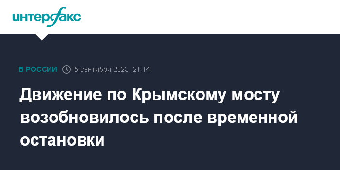 Москва. 5 сентября. INTERFAX.RU - Крымский мост открыт для движения автотранспорта после остановки почти на полтора часа, сообщает телеграм-канал, освещающий ситуацию на автомобильных подходах к мосту.