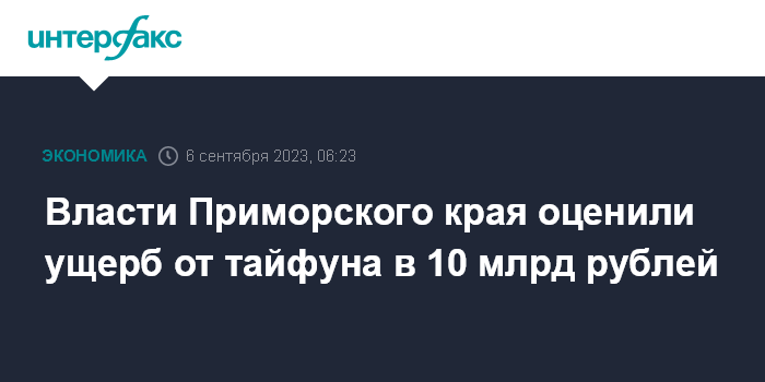 Москва. 6 сентября. INTERFAX.RU - Ущерб от тайфуна, в августе обрушившегося на Приморский край, предварительно оценивается в 10 млрд рублей, сообщила председатель правительства региона Вера Щербина.
