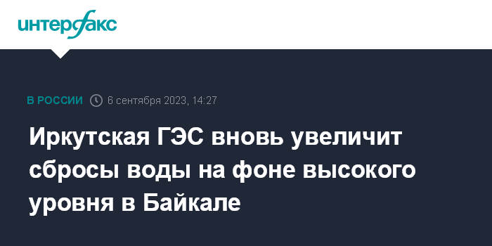 Москва. 6 сентября. INTERFAX.RU - Иркутская ГЭС с 7 сентября увеличит сброс воды до 3,3 тыс. кубометров в секунду, а с 11 сентября - до 3,4 тыс. кубометров в секунду. Об этом сообщили "Интерфаксу" в Енисейском бассейновом управлении Росводресурсов.