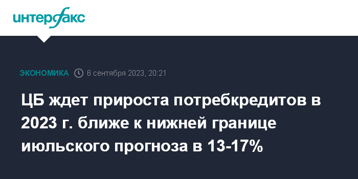 Москва. 6 сентября. INTERFAX.RU - ЦБ РФ ожидает прироста портфеля потребительских кредитов в 2023 году ближе к нижней границе диапазона июльского прогноза в 13-17%, говорится в аналитическом обзоре регулятора по банковскому сектору.