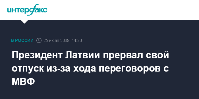 Москва. 25 июля. INTERFAX.RU - Президент Латвии Валдис Затлерс решил прервать свой отпуск, который проводил в Италии, в связи с ходом переговоров с Международным валютным фондом (МВФ), сообщил агентству ВNS руководитель президентской канцелярии Эдгар Ринкевич.