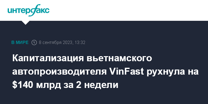 Москва. 8 сентября. INTERFAX.RU - Вьетнамский производитель электромобилей VinFast Auto Ltd. потерял более $140 млрд рыночной стоимости менее чем за две недели, пишет MarketWatch.