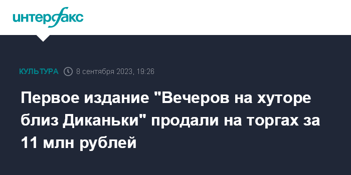 "Топ продаж возглавило первое прижизненное издание Николая Гоголя "Вечера на хуторе близ Диканьки. Повести, изданные пасичником Рудым Паньком" (...) Первоначальная ставка за гоголевский раритет в "Литфонде" была заявлена 7 млн рублей, финальная цена составила 11 млн рублей", - сообщили в пресс-службе "Литфонда".