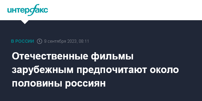 Москва. 9 сентября. INTERFAX.RU - Почти каждый второй россиянин (48%) смотрит фильмы отечественного производства чаще, чем зарубежного, свидетельствуют данные опроса Фонда "Общественное мнение" (ФОМ), опубликованные на официальном сайте социологического центра.