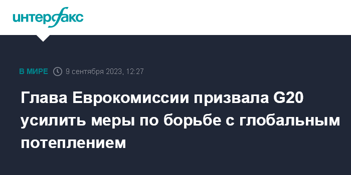 Москва. 9 сентября. INTERFAX.RU - Председатель Еврокомиссии (ЕК) Урсула фон дер Ляйен на саммите G20 в Дели выступила с призывом мобилизовать мировые усилия для удержания ограничения глобального потепления 1,5 градусами по Цельсию выше доиндустриальных уровней.