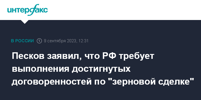 Песков заявил, что РФ требует выполнения достигнутых договоренностей по "зерновой сделке"