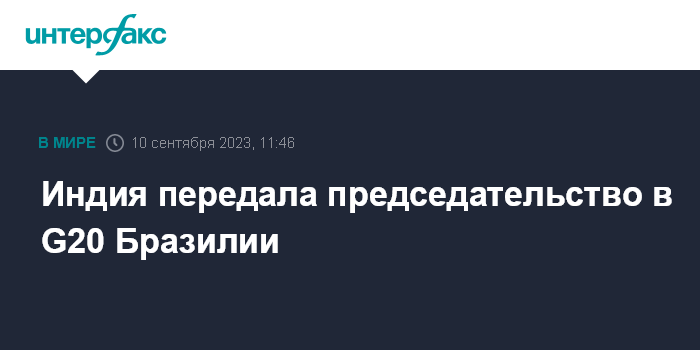 Москва. 10 сентября. INTERFAX.RU - Индия в воскресенье официально передала председательство в G20 Бразилии, где в 2024 году пройдет следующий саммит лидеров этого объединения стран, пишут индийские СМИ.