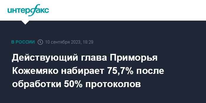 Действующий глава Приморья Кожемяко набирает 75,7% после обработки 50% протоколов
