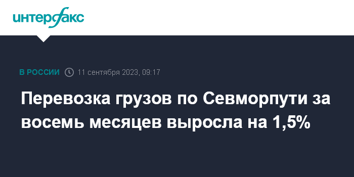 Москва. 11 сентября. INTERFAX.RU - Перевозка грузов по Северному морскому пути (СМП) за 8 месяцев 2023 года выросла на 1,5% - до 23 млн тонн, на маршрут возвращаются транзитные грузы. Об этом на сэссии ВЭФ сообщил специальный представитель "Росатома" по вопросам развития Арктики Владимир Панов.