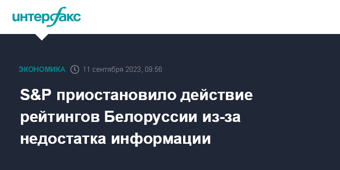 Москва. 11 сентября. INTERFAX.RU - Агентство S&P Global Ratings приостановило действие суверенных рейтингов Белоруссии из-за отсутствия информации для их поддержания.