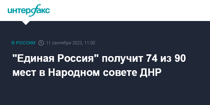Москва. 11 сентября. INTERFAX.RU - "Единая Россия" получает 74 депутатских места в Народном совете Донецкой народной республики по итогам прошедших выборов, заявил председатель избиркома ДНР Владимир Высоцкий.