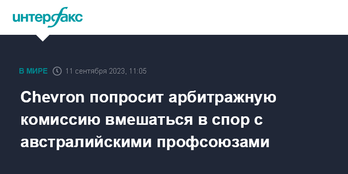 Москва. 11 сентября. INTERFAX.RU - Chevron Australia, дочерняя компания американской Chevron Corp., попросит австралийскую Арбитражную комиссию по трудовым отношениям (Fair Work Commission, FWC) вмешаться в ситуацию с забастовкой на СПГ-площадках Gorgon и Wheatstone, пишет Financial Times.