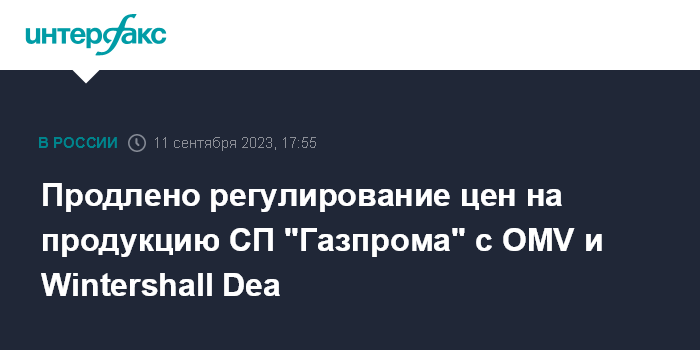Москва. 11 сентября. INTERFAX.RU - Регулирование стоимости реализации продукции совместных предприятий "Газпрома" с германской Wintershall Dea и австрийской OMV правительством РФ продлено сроком на год - соответствующие изменения внесены в указ президента Владимира Путина № 943.
