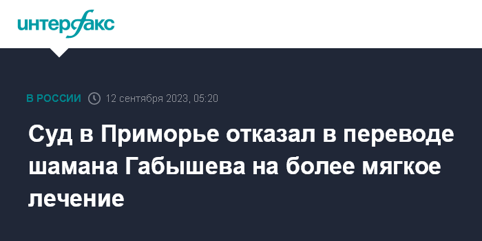 Москва. 12 сентября. INTERFAX.RU - Уссурийский районный суд во вторник отказал в переводе якутского шамана Александра Габышева в психиатрическую больницу общего типа, сообщил защитник шамана Алексей Прянишников.